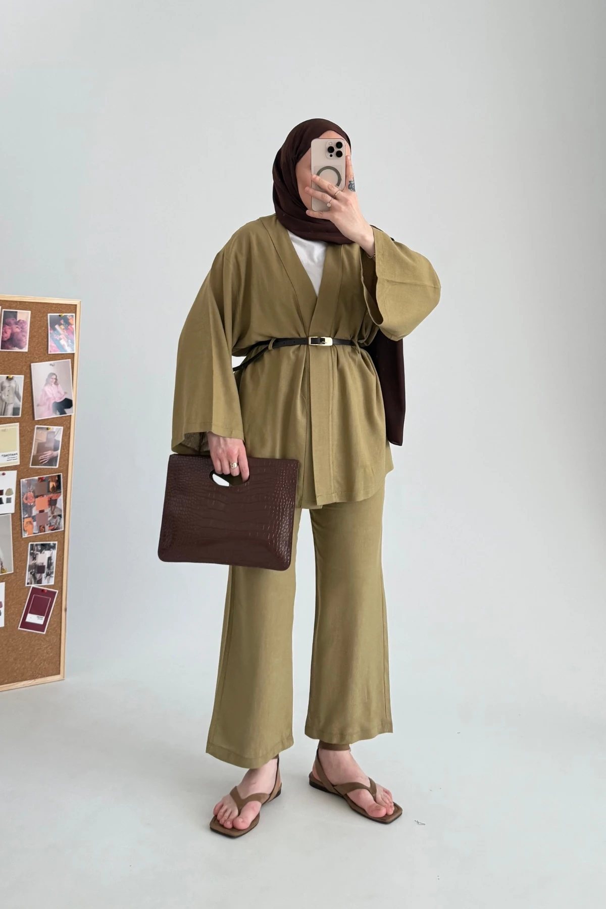 Ürün özellikleri:Premium kalite pamuklu yumuşak gabardinden, yakalı, önü çıtçıtlı, kapalı ön cepli, kuşaklı oversize ceket takım. Düşük omuzlu, uzun kollu, manşetleri çıtçıtlı. %100 pamuklu. Ceket 68 cm, pantolon 114 cm.Model 165 boy 52 kilo S beden.