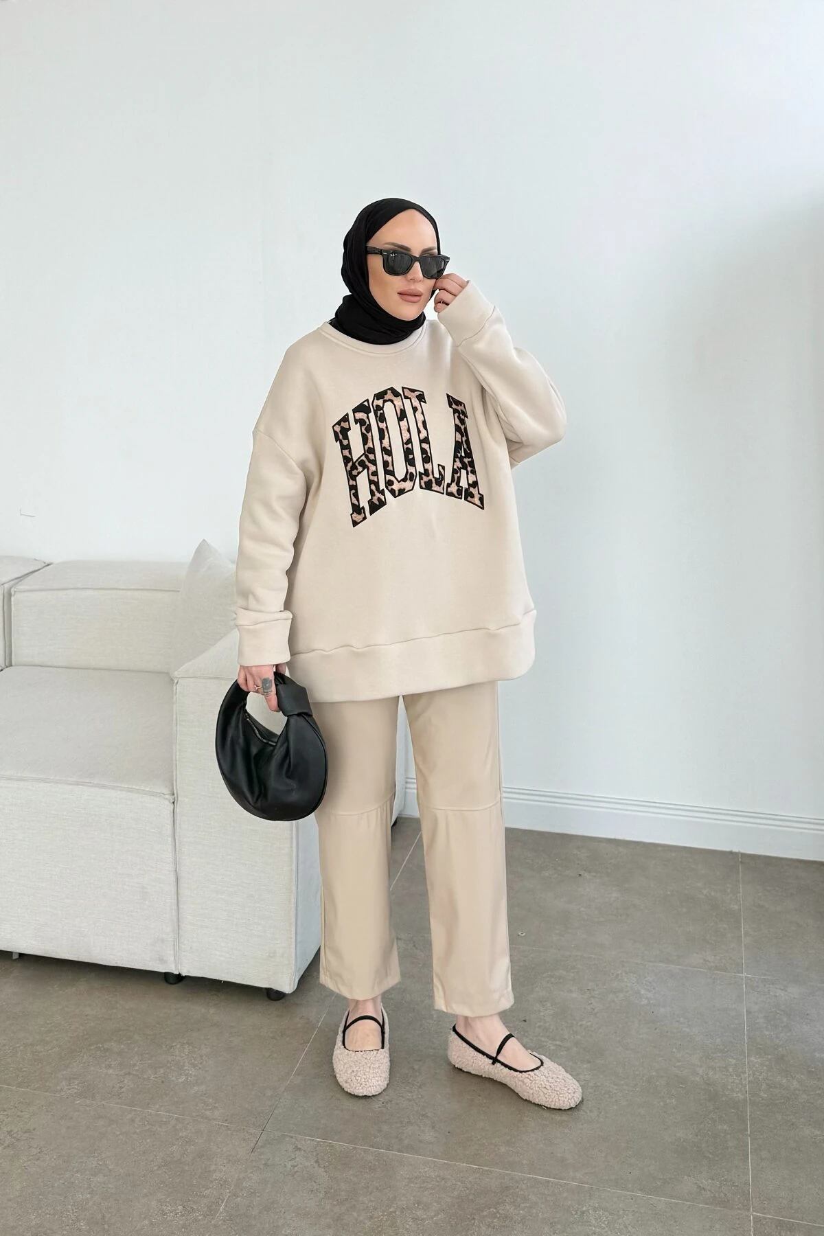 Sweatshirt bayan tesettür modelleri arasında minimal desenlere sahip olan parçalar daha kolay şekilde kombinlenir. Yazı desenleri bulunan tesettür sweatshirt kombinleri de hareketli alt giyim parçaları ile kola şekilde kombinlenebilir.